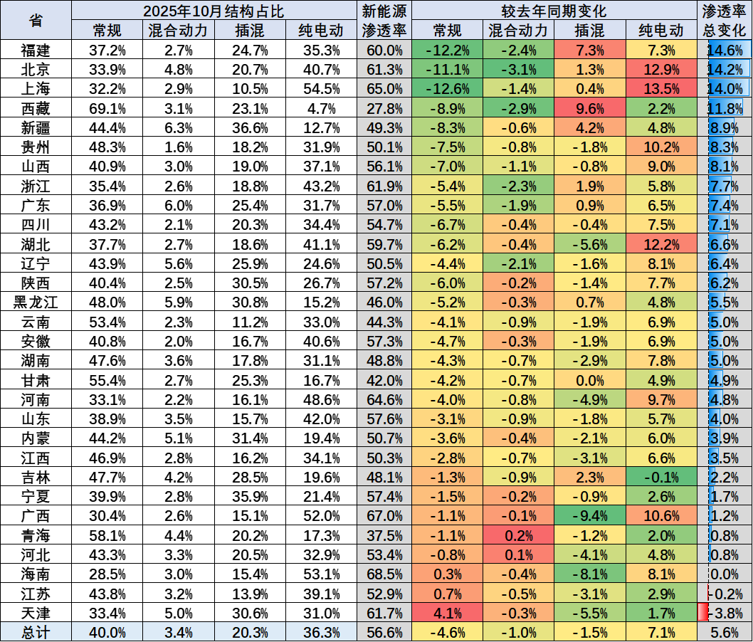 从过去几年各地车市的发展状态来看,“北强南弱”格局持续,北方车市2025年10月较上年同期的份额下降0.2个百分点,2025年较2022年的北方份额增长5.6个百分点。北方车市的走强应该是目前核心的特征,东北和西北车市的走强明显,带动总体西部车市超强发展。10月由于各地补贴政策的变化从而市场结构变化较复杂。