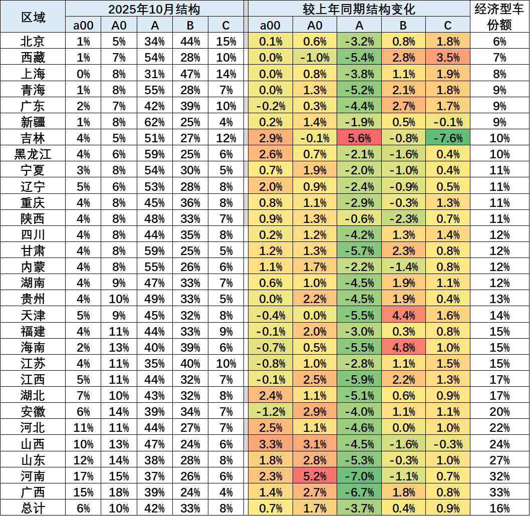 “北强南弱”特征明显。从过去几年各地车市的发展状态来看,“北强南弱”格局持续,虽然北方车市2025年10月较上年同期的份额下降0.2个百分点,但2025年较2022年的北方份额增5.6个百分点;补贴政策鼓励中低端,经济型车回暖,体现了政策的公平。随着“双新”补贴的推动,华北、东北地区的A00级车表现优秀,大部分地区的A0级电动车也呈现较强增长态势,政策补贴让经济型电动车受益最大是政策公平性的核心体现,补贴鼓励小微型电动车发展的普及意义重大。