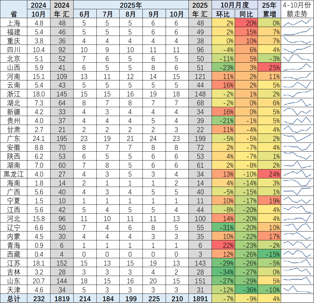 今年上半年,重庆、湖北、广东、江苏等多地曾先后出现过无法申领“国补”的情况。此后随着资金的下达,这些地区都已陆续恢复相关补贴。今年10月,青海、贵州、内蒙古自治区等多地宣布暂停汽车置换更新补贴。从10月的环比变化看,黑龙江、西藏、青海、内蒙等的环比8月走势偏弱。