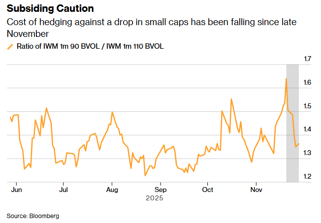 与此同时,罗素2000指数看涨期权的相对成本下降也使得对小盘股的看涨押注更具吸引力。由于对罗素2000指数进一步下跌的防护需求减弱,所谓的看涨期权偏度(衡量更看涨期权的相对成本)保持低位,这为投资者提供了押注小盘股上涨的机会。