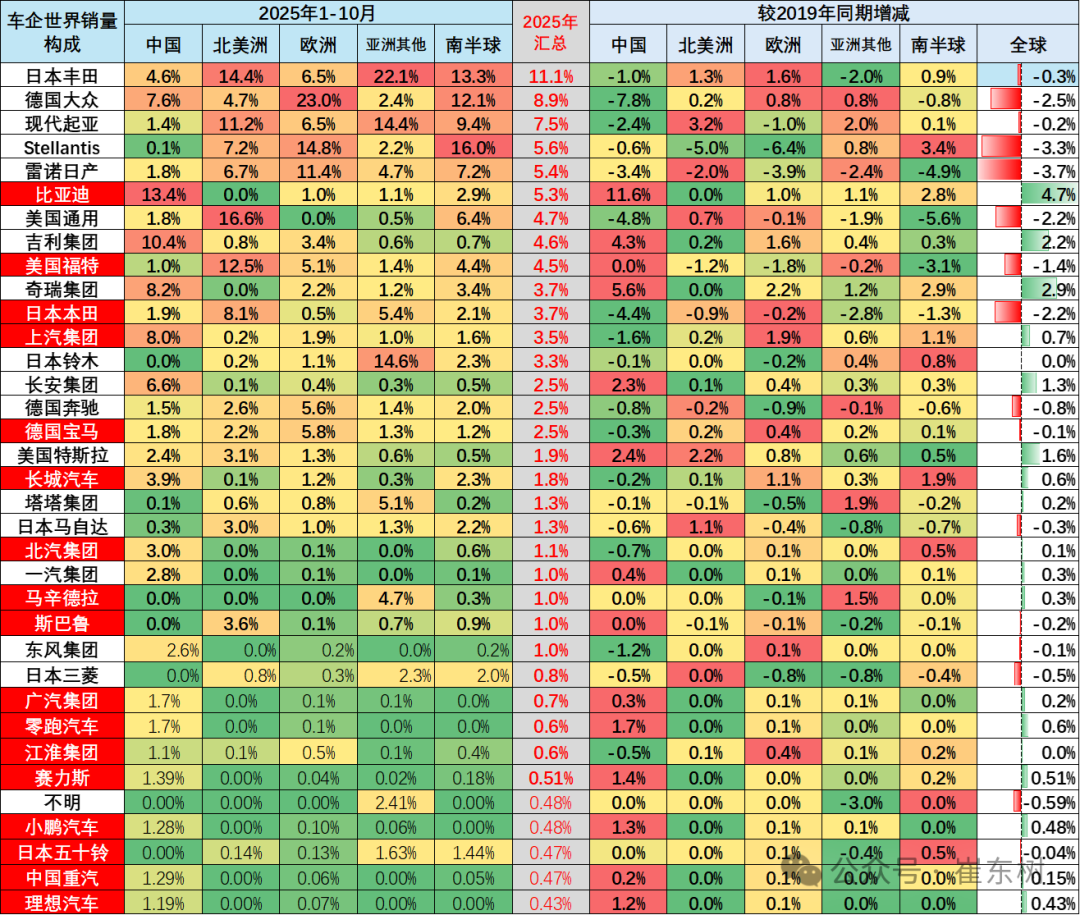 2025年1-10月欧洲车企普遍较弱,尤其雷诺日产份额较2019年下降3.7%、stellantis大众的表现相对较弱,份额较2019年下降3.3%,中国市场压力大。大众集团的全球其它市场总体改善较大,南半球市场回升较明显。