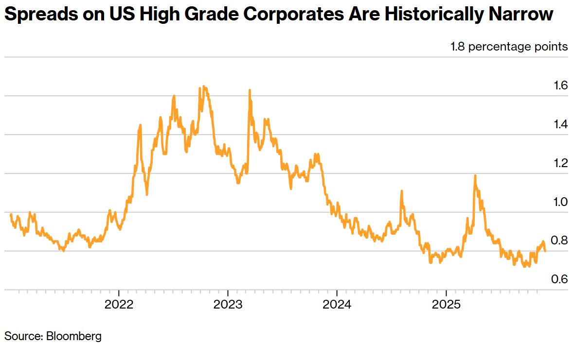 截至上周五,美国高级别公司债券的利差平均约为0.8个百分点(80个基点)。数据显示,过去二十年的平均利差更接近1.48个百分点。截至上周五,这些债券在今年内上涨了约8%。