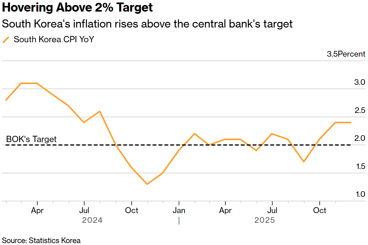 最新通胀数据发布前几天,韩国央行刚刚决定将基准利率维持在2.5%不变,并略微上调了增长和通胀预期,同时暗示对政策前景采取更平衡的立场。韩国央行行长李昌镛表示,对于是否有必要进一步降息,委员会内部意见分歧较大。