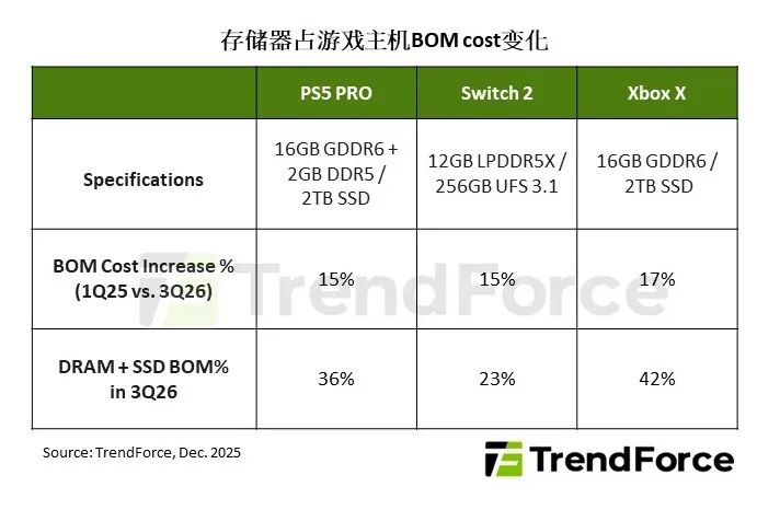 对于Sony(索尼)与Microsoft(微软)而言,2026年存储器成本占BOM cost的比例超过35%,这将导致主机上市数年后难以执行传统的降价策略,甚至在部分地区需调涨售价以转嫁成本,如Xbox便传将继2025年9月调涨价格后,再度涨价。在此背景下,厂商恐被迫打破以价求量的产业惯例,转而采取高售价确保获利的防御性定价策略。
