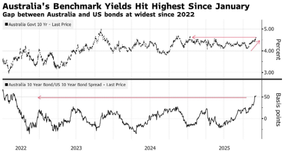 澳洲联储可能加息的这一前景,很可能会使澳大利亚的主权债券市场前景恶化。此前,这些债券在 11 月遭遇了自一年来最大的单月跌幅。这是因为这些债券受到了由美联储预期以及日本和欧洲财政压力所引发的全球抛售潮的影响。