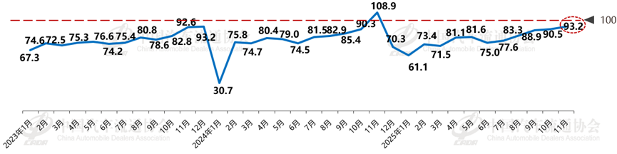 智通财经APP获悉,12月2日,中国汽车流通协会发布最新一期“汽车消费指数”,2025年11月汽车消费指数为93.2,高于上月,预计12月汽车市场好于11月。