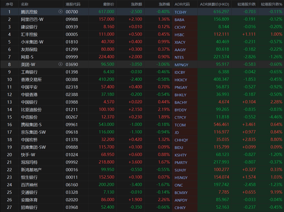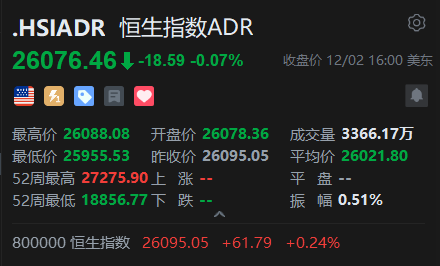 智通财经APP获悉,周二,美股三大指数集体上涨。恒生指数ADR下跌,按比例计算,收报26076.46点,较香港收市跌18.59或0.07%。