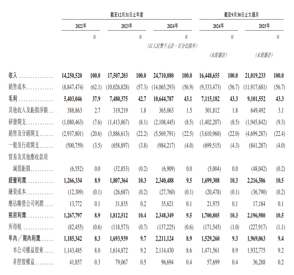 于2022年、2023年、2024年以及截至2024年及2025年9月30日止九个月,公司分别录得毛利人民币54.03亿元、人民币74.80亿元、人民币106.45亿元、人民币71.15亿元及人民币91.02亿元。于2022年、2023年、2024年以及截至 2024年及2025年9月30日止九个月,公司的毛利率分别为37.9%、42.7%、43.1%、 43.3%及43.3%。于往绩记录期间,毛利率增长主要受产品高端化带来的利润率提升所推动。例如,智能家居及创新产品以及智能影音产品的毛利率于往绩记录期间持续提升。