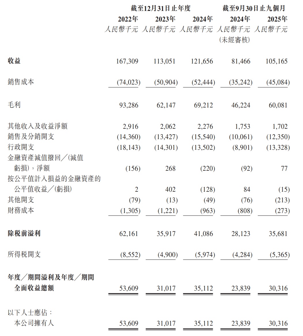 于2022年度、2023年度、2024年度及2025年截至9月30日止九个月,公司分别录得年/期内溢利及全面收益总额5360.9万元、3101.7万元、3511.2万元及3031.6万元。