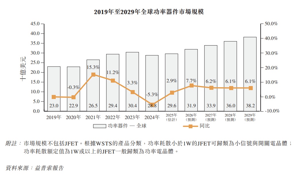 全球功率器件市场包括用于功率电子的晶闸管、电晶体管和二极管等元件,彼等对汽车、工业和消费电子等行业至关重要。功率器件的市场规模从2019年的约230亿美元增至 2024年的约288亿美元,该期间的复合年增长率约4.6%。