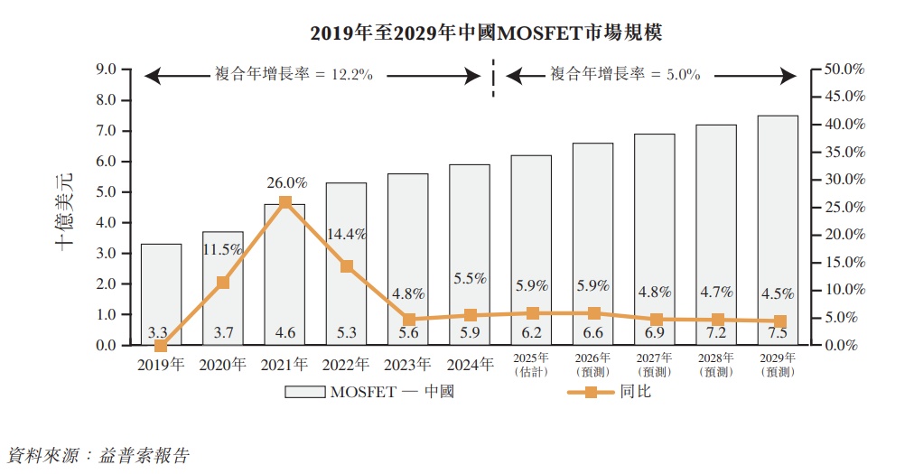 经历前几年的快速增长后,中国MOSFET市场正在过渡至一个更成熟的阶段,其特点是竞争加剧及市场饱和。尽管预计未来数年市场增长率将放缓,中国MOSFET市场的总市场规模预计仍将由2025年的约62亿美元增至2029年的约75亿美元,复合年增长率约为5.0%。在各个下游应用领域的持续需求及MOSFET技术不断进步的推动下,预计这一时期将实现稳定增长。