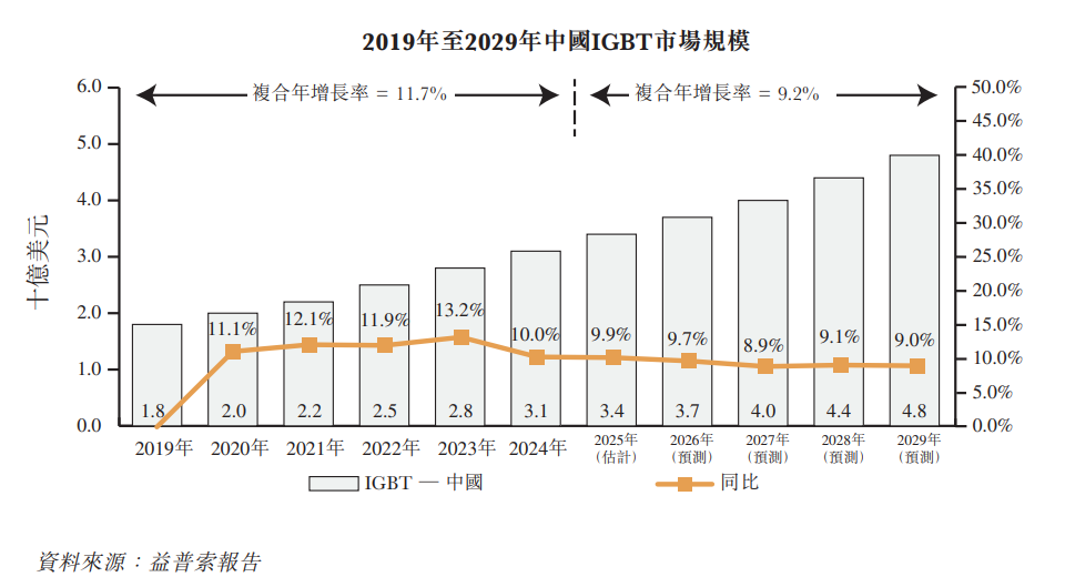 受下游行业市场需求的推动,尤其是新能源汽车领域(包括电机驱动控制系统、汽车空调控制系统及充电站)及新能源发电,并在《十四五节能减排综合工作方案》的进一步支持下,中国IGBT市场需求经历快速持续增长。该进展得到《中华人民共和国国民经济和社会发展第十四个五年计划和2035年远景目标纲要》的进一步支持,当中强调在先进集成电路工艺及IGBT等特殊工艺方面取得突破的重要性。2019年至2024年,中国IGBT市场呈现快速稳定增长。中国IGBT市场的市场规模由2019年的约18亿美元增至2024年的约31亿美元,复合年增长率约为11.7%。