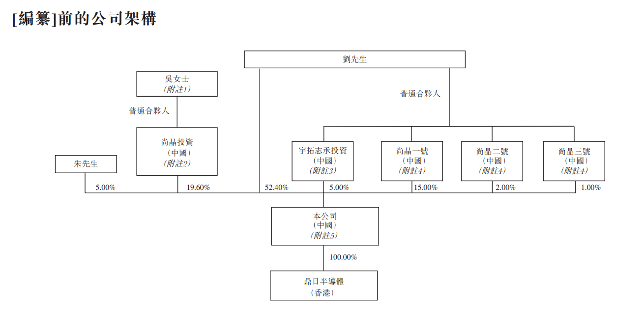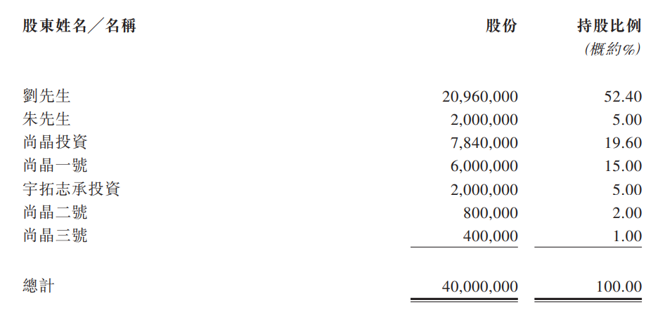 刘先生与吴女士(刘先生的配偶)合计拥有公司已发行股本总额约95.0% 的权益,包括(i)刘先生直接持有约52.40%的权益,(ii)刘先生以唯一普通合伙人身份控制以下各项权益而间接控制的合计约23.00%的权益:(1)尚晶一号15.00%权益、(2)宇拓志承投资 5.00%权益、(3)尚晶二号2.00%的权益及(4)尚晶三号1.00%的权益;及(iii)尚晶投资(吴女士为其唯一普通合伙人)间接持有约19.60%的权益。