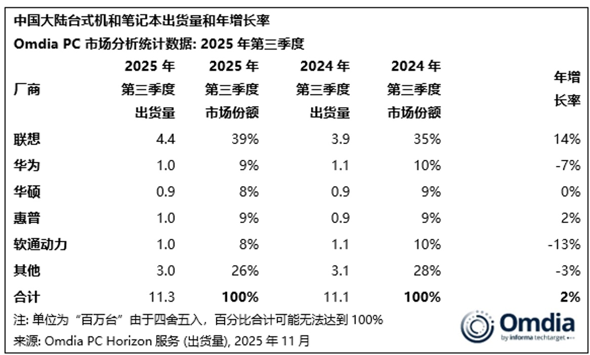Omdia 最新监测数据显示,2025 年第三季度中国 PC 市场(含台式机、笔记本及工作站)总出货量达1130万台,同比增长2%。在此背景下,联想以440万台的出货量、39%的市场份额稳居行业第一,同比增速更达14%,远超市场整体增长水平,成为拉动行业增长的关键力量。