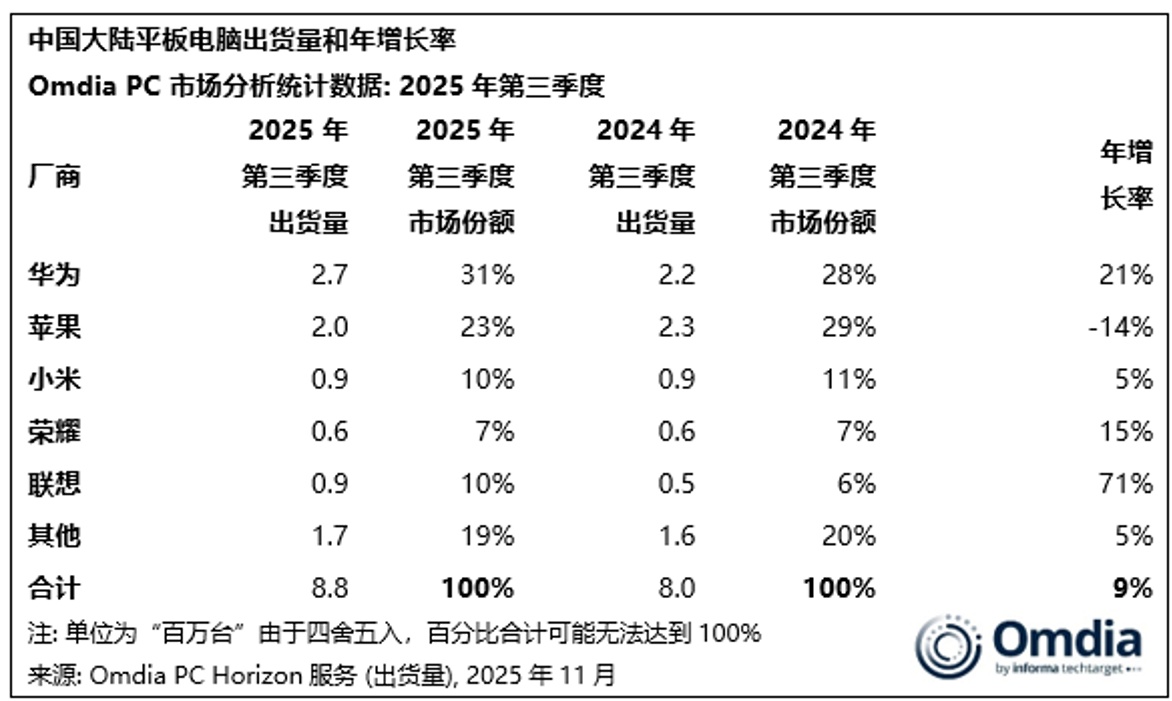 而联想在平板领域的表现同样抢眼,成为其另一大增长引擎。Omdia 数据显示,2025 年第三季度联想在中国市场的平板出货量达90万台,同比激增71%,市场份额提升至 10%,增速在头部厂商中位居前列。