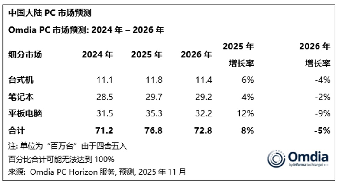 目前,联想已将端侧AI助手、跨设备互联、AI应用等功能融入PC与平板产品,通过统一的AI后台能力,为生产力场景用户提供更具吸引力的价值体验。Omdia预计,2025年大中华区32%的PC具备AI能力,2026年这一比例将提升至46%。