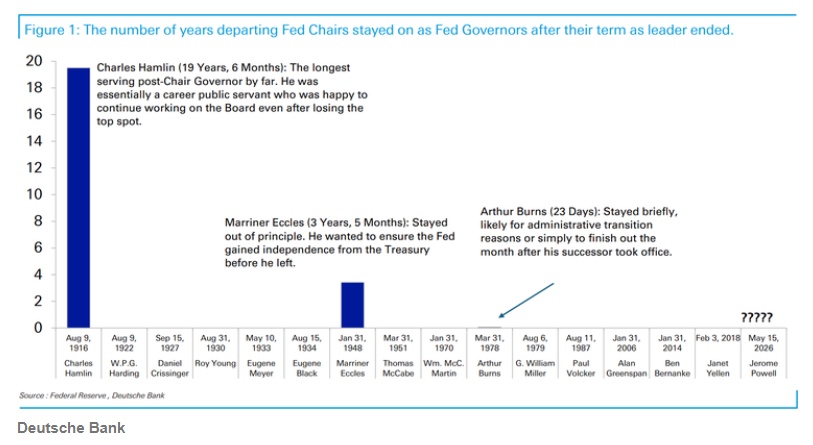 对此,德意志银行周二指出,美联储主席在任期结束后,仍可继续履行其作为美联储理事的任命,鲍威尔可能面临类似情况。