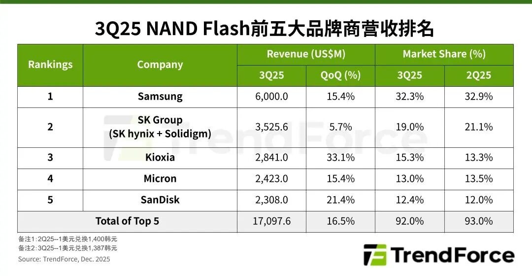 SSD(企业级SSD)需求强劲,带动前五大NAND Flash品牌商合计营收季增16.5%,逼近171亿美元。其中,Kioxia(铠侠)第三季受惠于AI