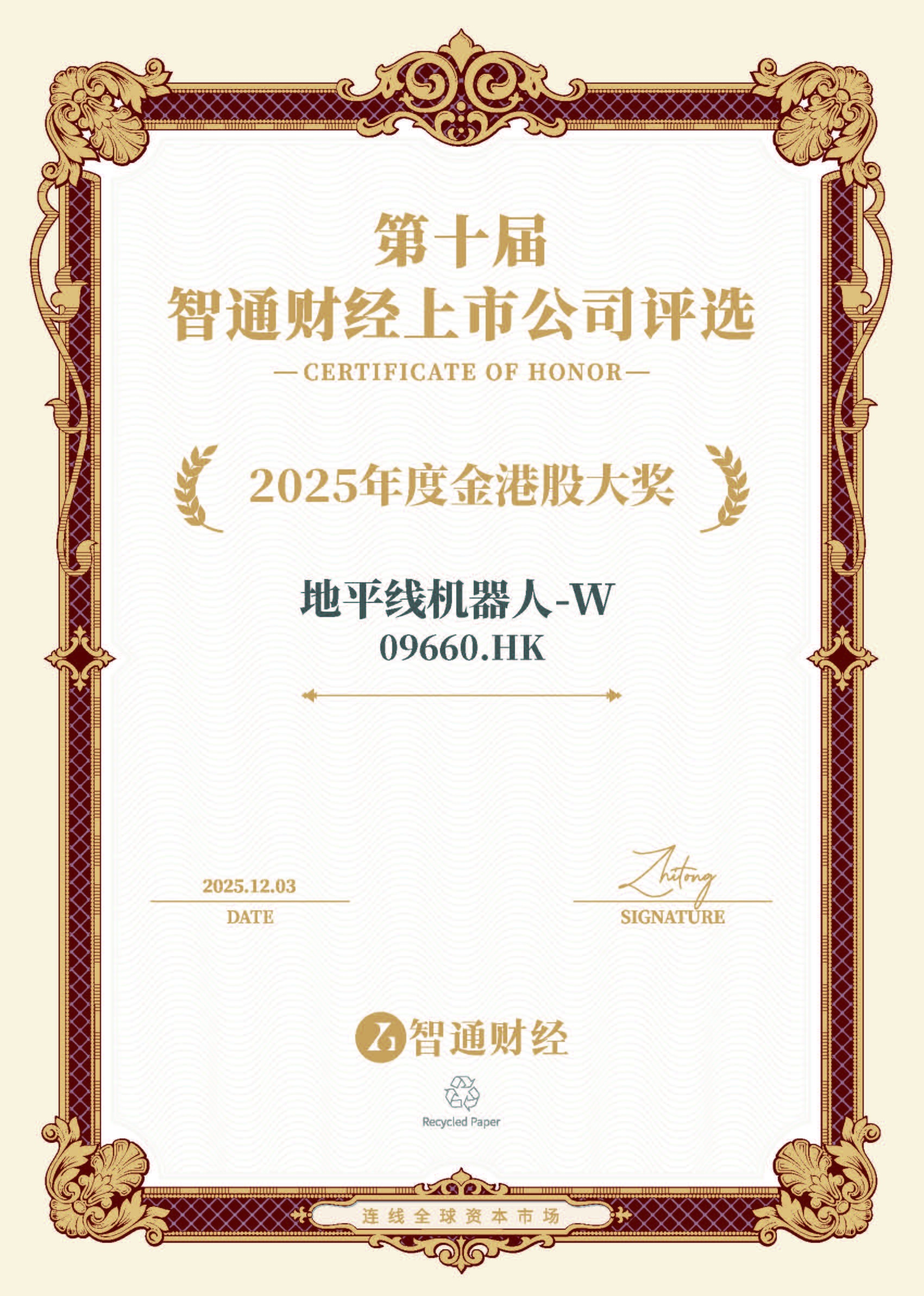 2025年12月3日,在由智通财经与新智基金网联合主办、冬日暖阳Donova独家承办的“第十届智通财经上市公司颁奖盛典”上,地平线机器人-W(09660)凭借卓越的经营表现、可持续的发展潜力及突出的综合实力,成功摘得“2025年度金港股大奖”。