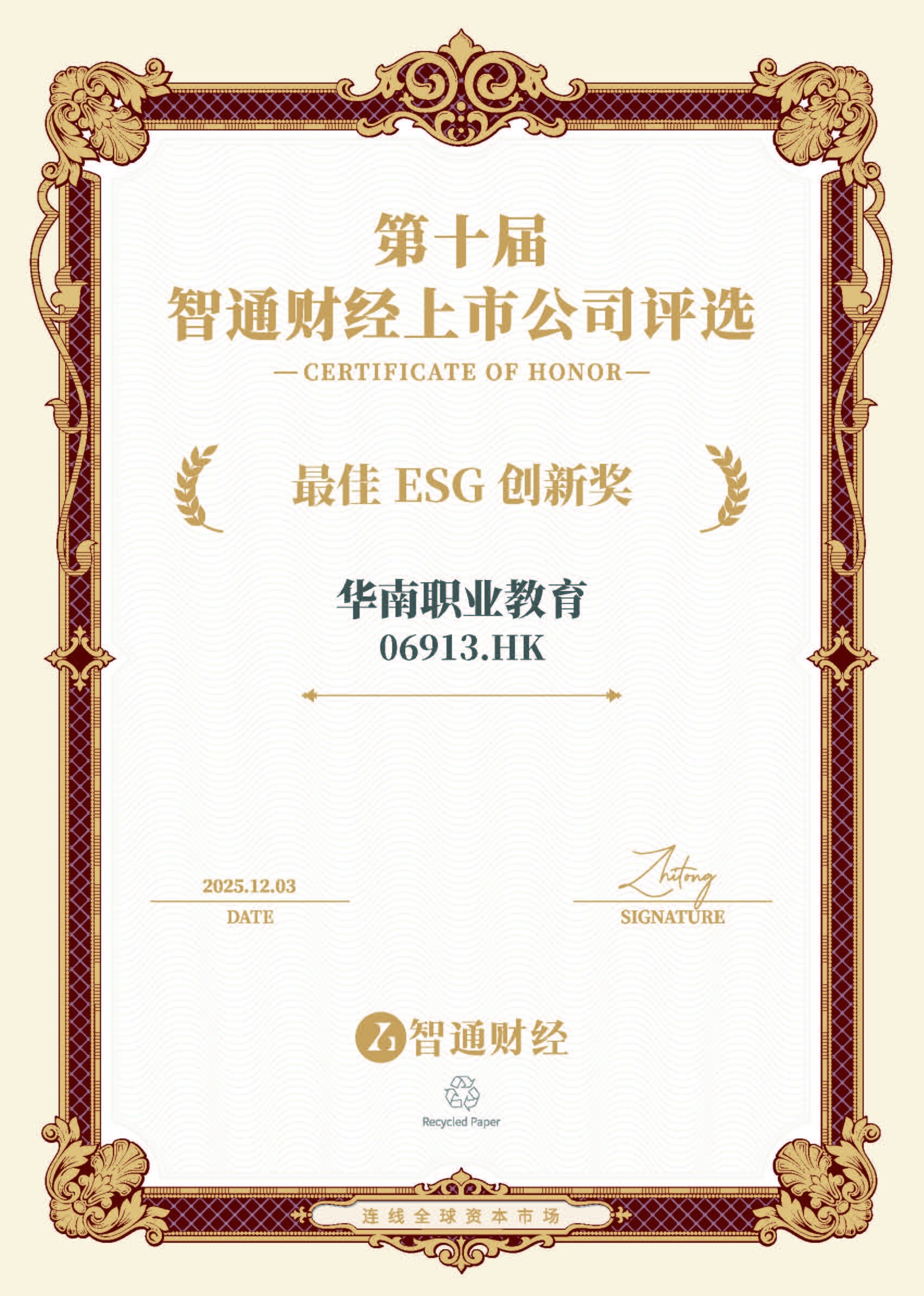 2025年12月3日,在由智通财经与新智基金网联合主办、冬日暖阳Donova独家承办的“第十届智通财经上市公司颁奖盛典”上,华南职业教育(06913)凭借其在环境、社会和治理(ESG)领域的创新实践与突出贡献,荣获“最佳ESG创新奖”。