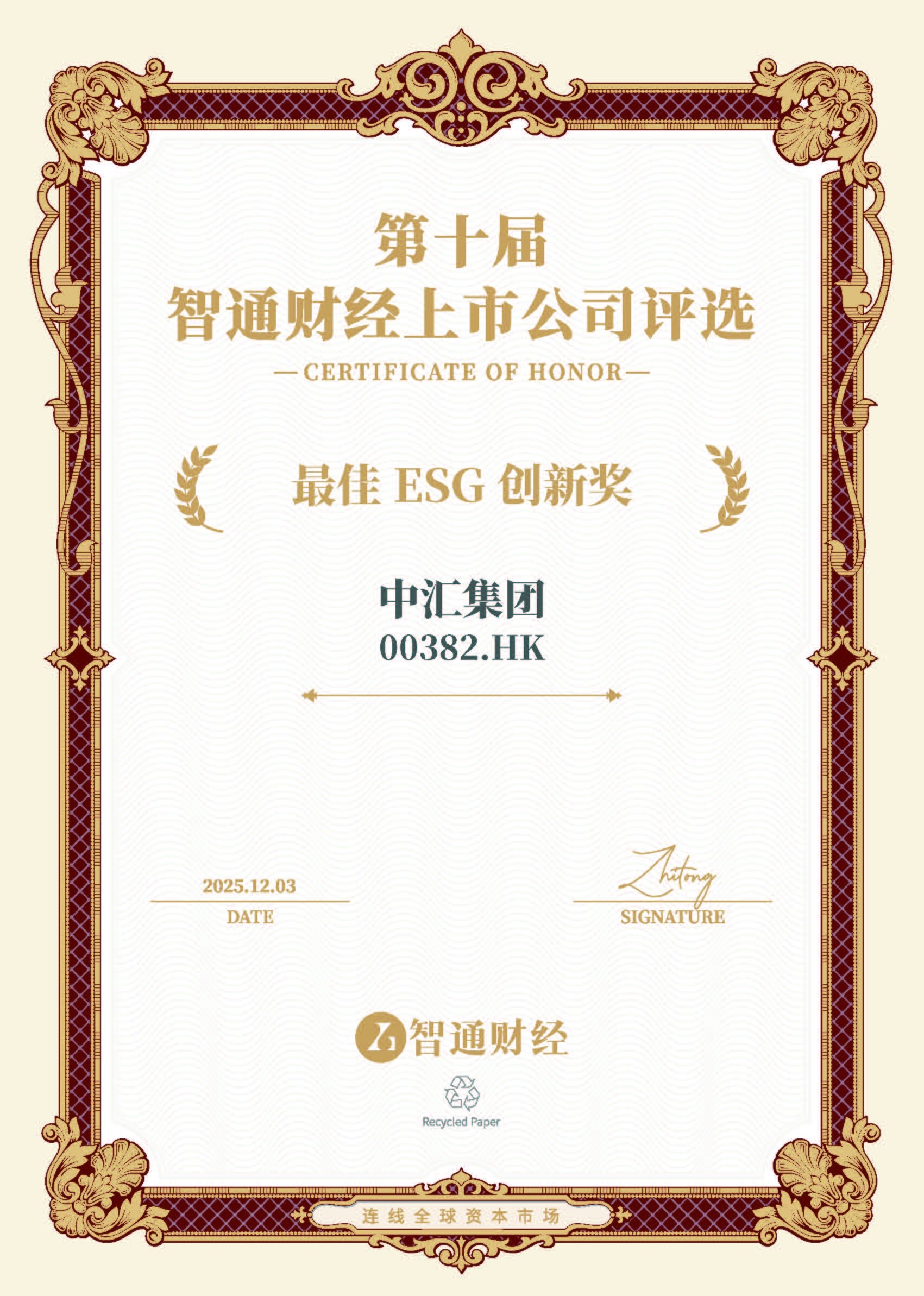 2025年12月3日,在由智通财经与新智基金网联合主办、冬日暖阳Donova独家承办的“第十届智通财经上市公司颁奖盛典”上,中汇集团(00382)凭借其在环境、社会和治理(ESG)领域的创新实践与突出贡献,荣获“最佳ESG创新奖”。