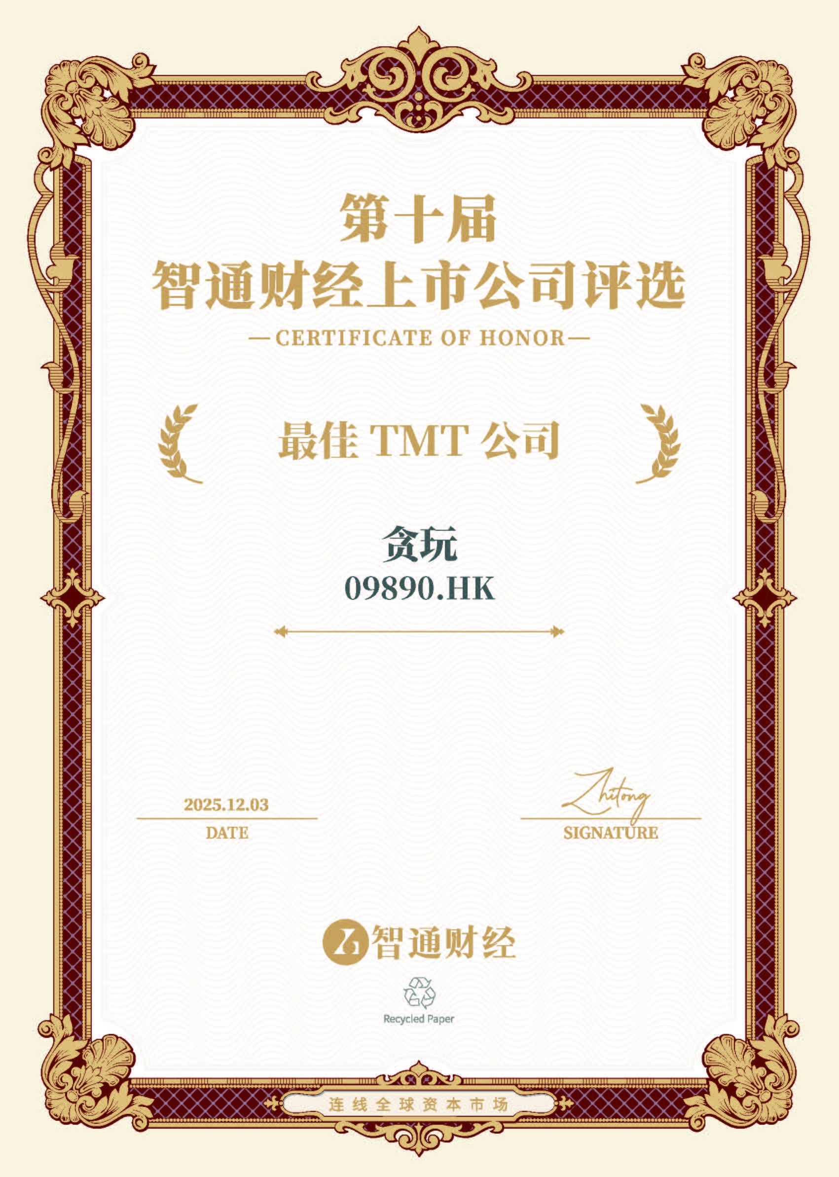 “最佳TMT公司”奖项旨在表彰公司治理结构健康、行业地位显著、主营业务良好,并能持续为投资者提供稳定回报的TMT类港美股上市公司。贪玩(09890)此次获奖,充分体现了资本市场对其技术创新能力、行业发展影响力及持续增长潜力的高度认可。