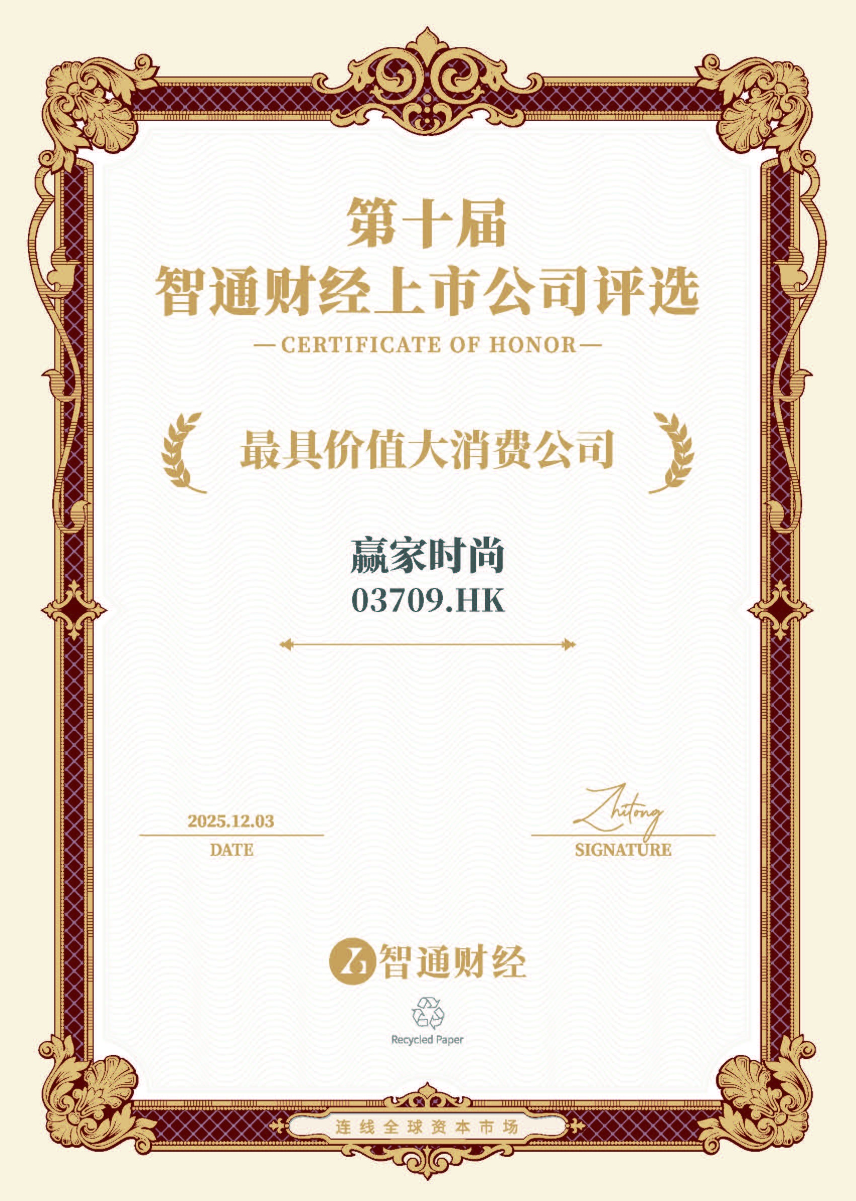 “最具价值大消费公司”奖项专注于消费领域,旨在表彰公司治理结构健康、行业地位突出、主营业务稳健,并能够为投资者提供持续、稳定价值回报的港美股上市公司。赢家时尚(03709)此次获奖,充分体现了资本市场对其在消费赛道中卓越的经营管理能力与长期投资价值的高度认可。