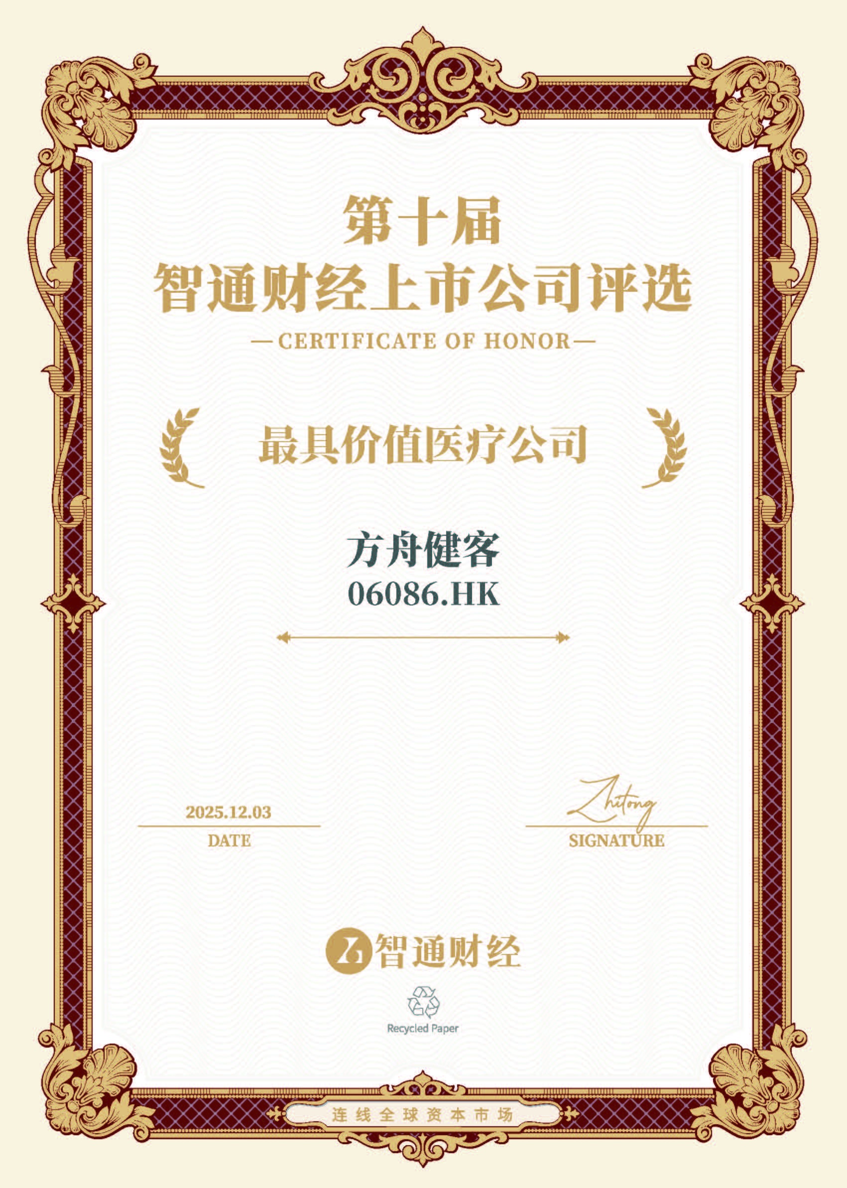 2025年12月3日,在由智通财经与新智基金网联合主办、冬日暖阳Donova独家承办的"第十届智通财经上市公司颁奖盛典"上,方舟健客(06086)凭借其在医疗健康服务领域的专业能力与卓越表现,荣获"最具价值医疗公司"奖。