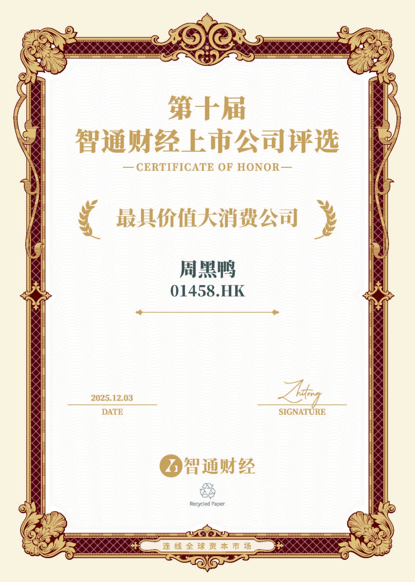 2025年12月3日,在由智通财经与新智基金网联合主办、冬日暖阳Donova独家承办的“第十届智通财经上市公司颁奖盛典”上,周黑鸭(01458)凭借其健康的治理结构、显著的行业地位、稳健的主营业务及持续为投资者创造稳定回报的综合实力,荣获“最具价值大消费公司”奖。