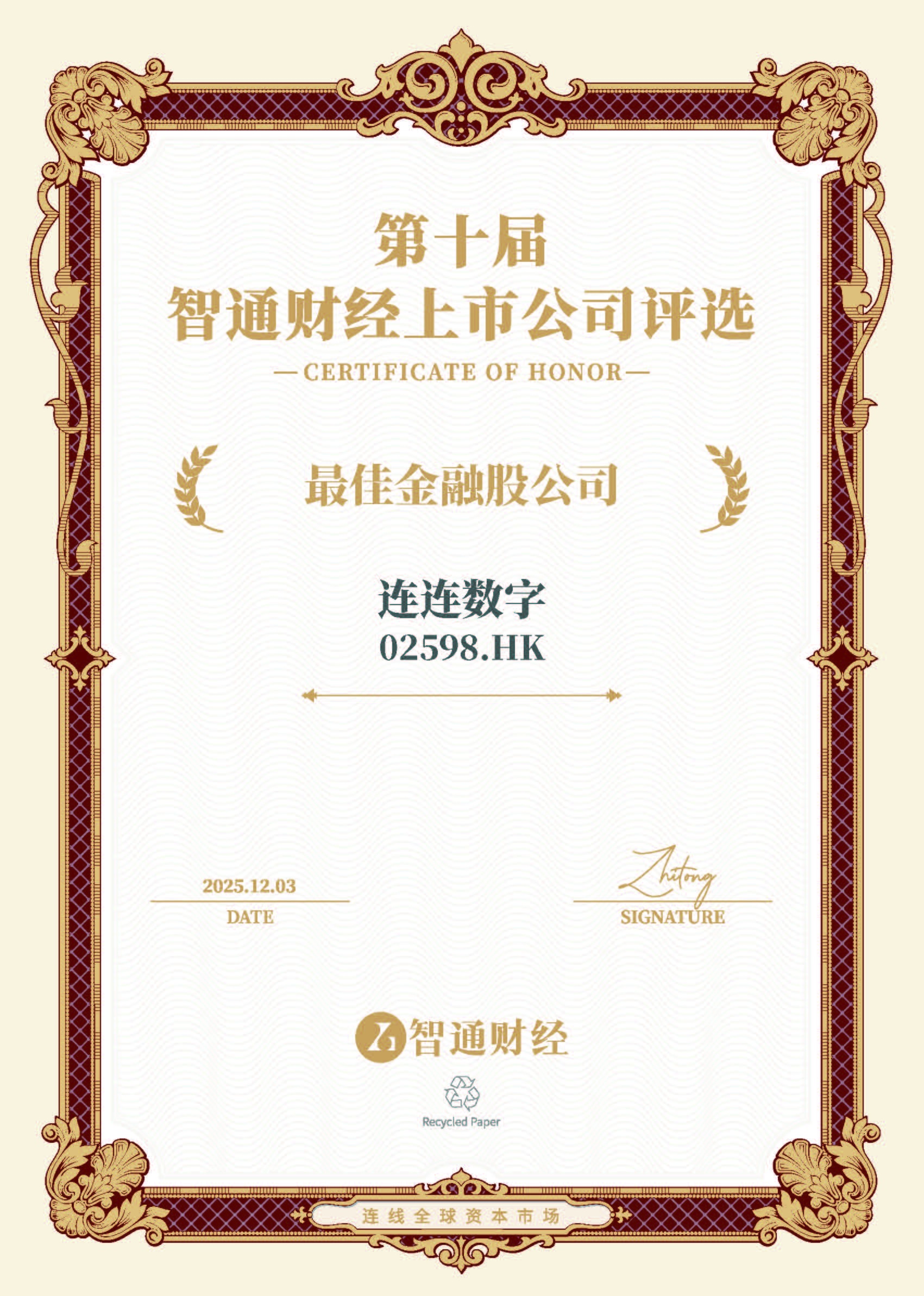2025年12月3日,在由智通财经与新智基金网联合主办、冬日暖阳Donova独家承办的“第十届智通财经上市公司颁奖盛典”上,连连数字(02598)凭借其在金融领域的稳健经营与卓越表现,荣获“最佳金融股公司”奖。