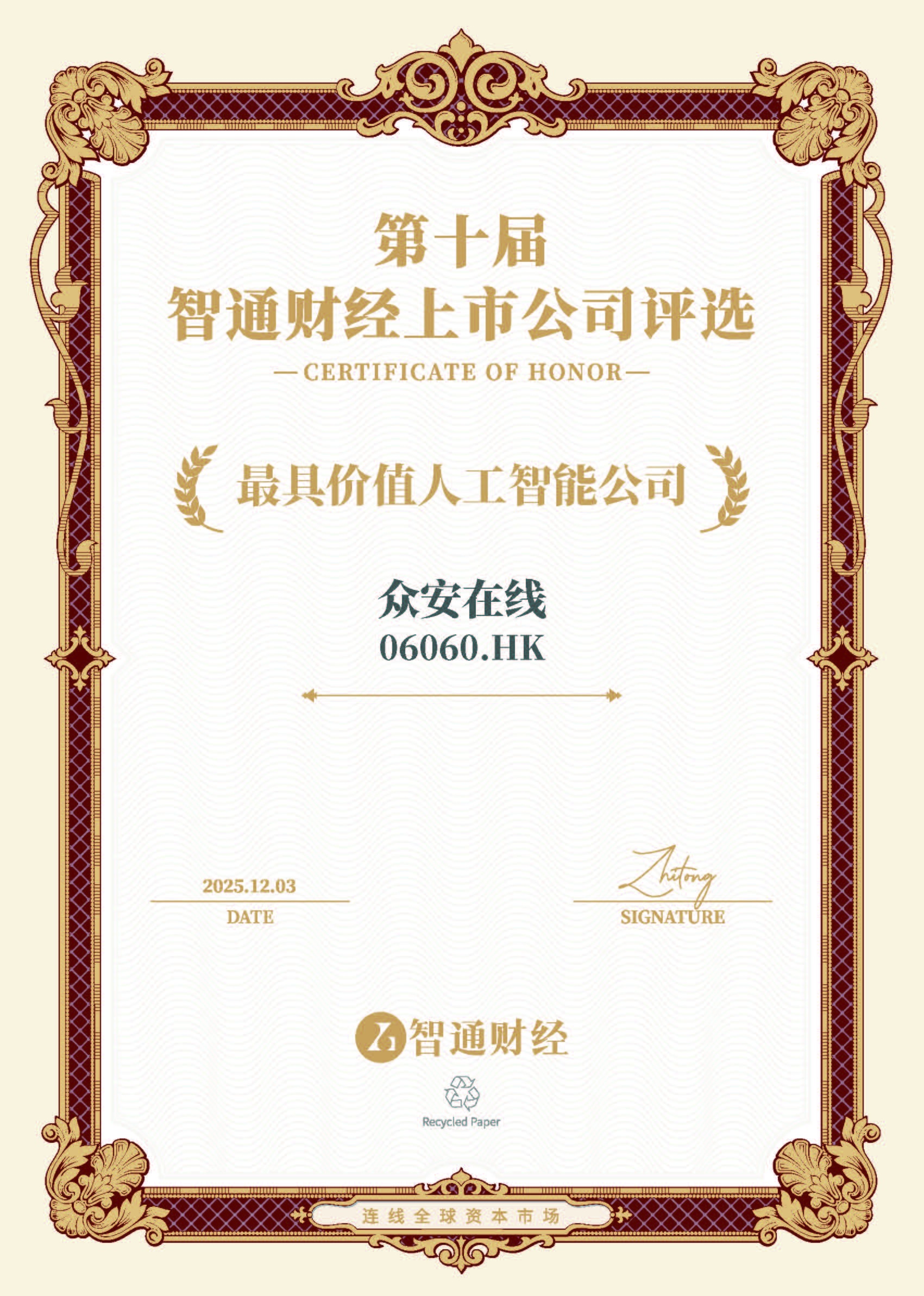 2025年12月3日,在由智通财经与新智基金网联合主办、冬日暖阳Donova独家承办的“第十届智通财经上市公司颁奖盛典”上,众安在线(06060)凭借其在人工智能领域展现出的全面领先实力与高成长性,荣获“最具价值人工智能公司”奖。