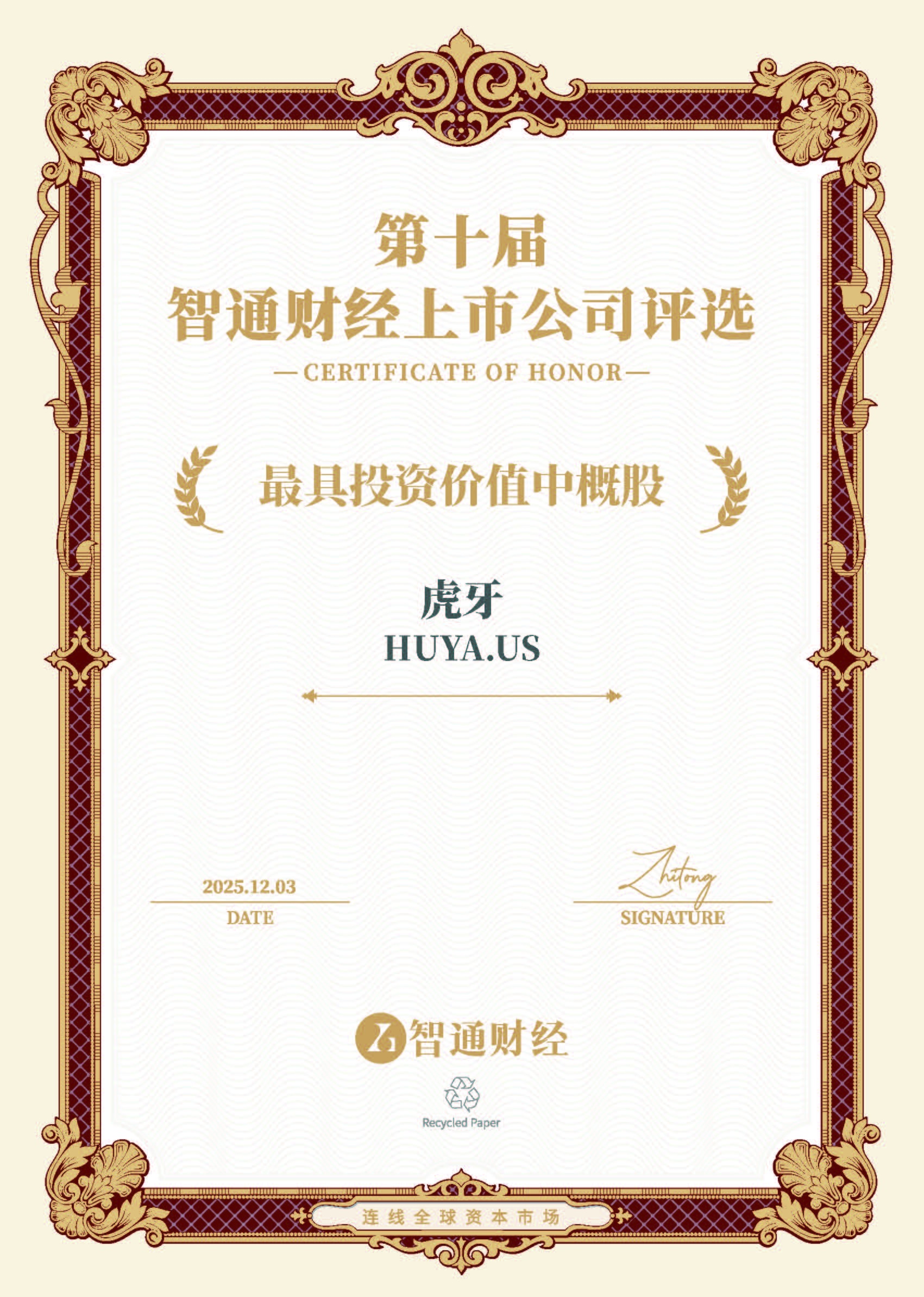 2025年12月3日,在由智通财经与新智基金网联合主办、冬日暖阳Donova独家承办的“第十届智通财经上市公司颁奖盛典”上,虎牙(HUYA.US)凭借其卓越的商业模式、优良的经营质效、持续的价值创造能力以及积极的社会责任实践,荣获“最具投资价值中概股”大奖。