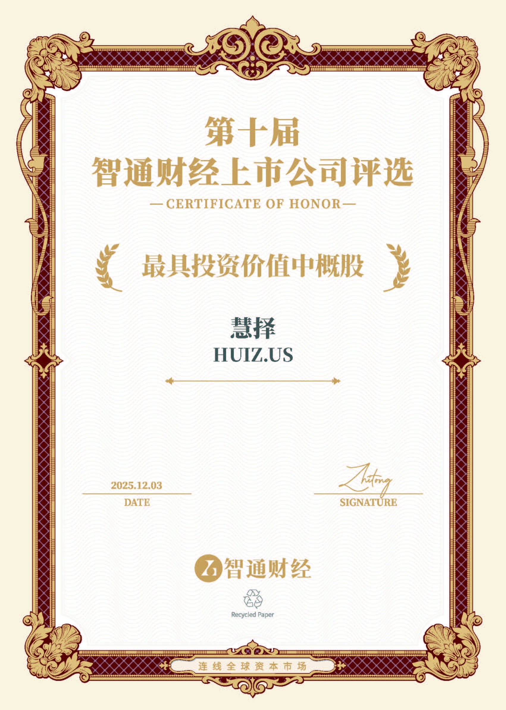 2025年12月3日,在由智通财经与新智基金网联合主办、冬日暖阳Donova独家承办的“第十届智通财经上市公司颁奖盛典”上,慧择(HUIZ.US)凭借其卓越的商业模式、优良的经营质效、持续的价值创造能力以及积极的社会责任实践,荣获“最具投资价值中概股”大奖。