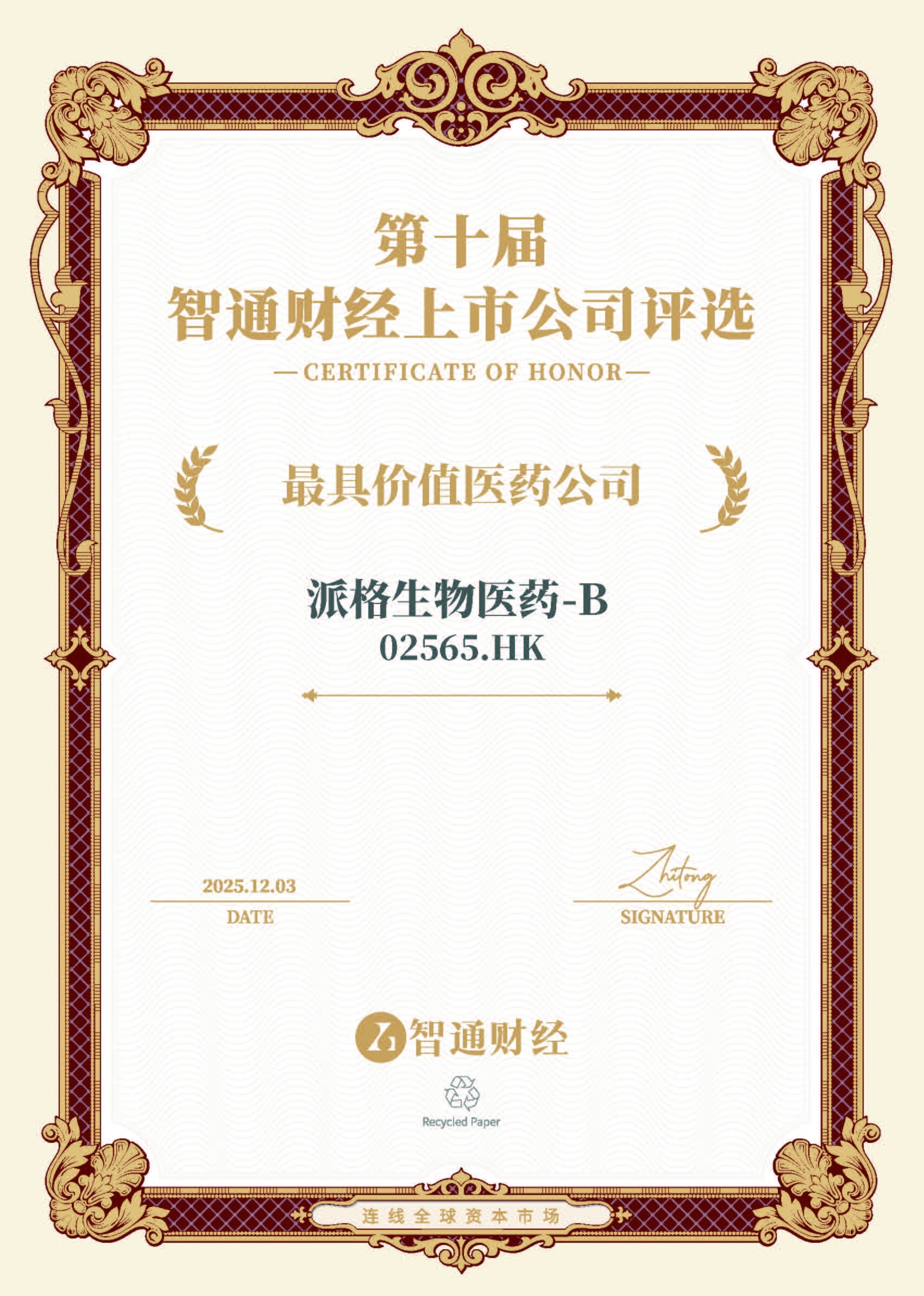 2025年12月3日,在由智通财经与新智基金网联合主办、冬日暖阳Donova独家承办的“第十届智通财经上市公司颁奖盛典”上,派格生物医药-B(02565)凭借其在医药创新领域的突出实力与卓越表现,荣获“最具价值医药公司”奖。