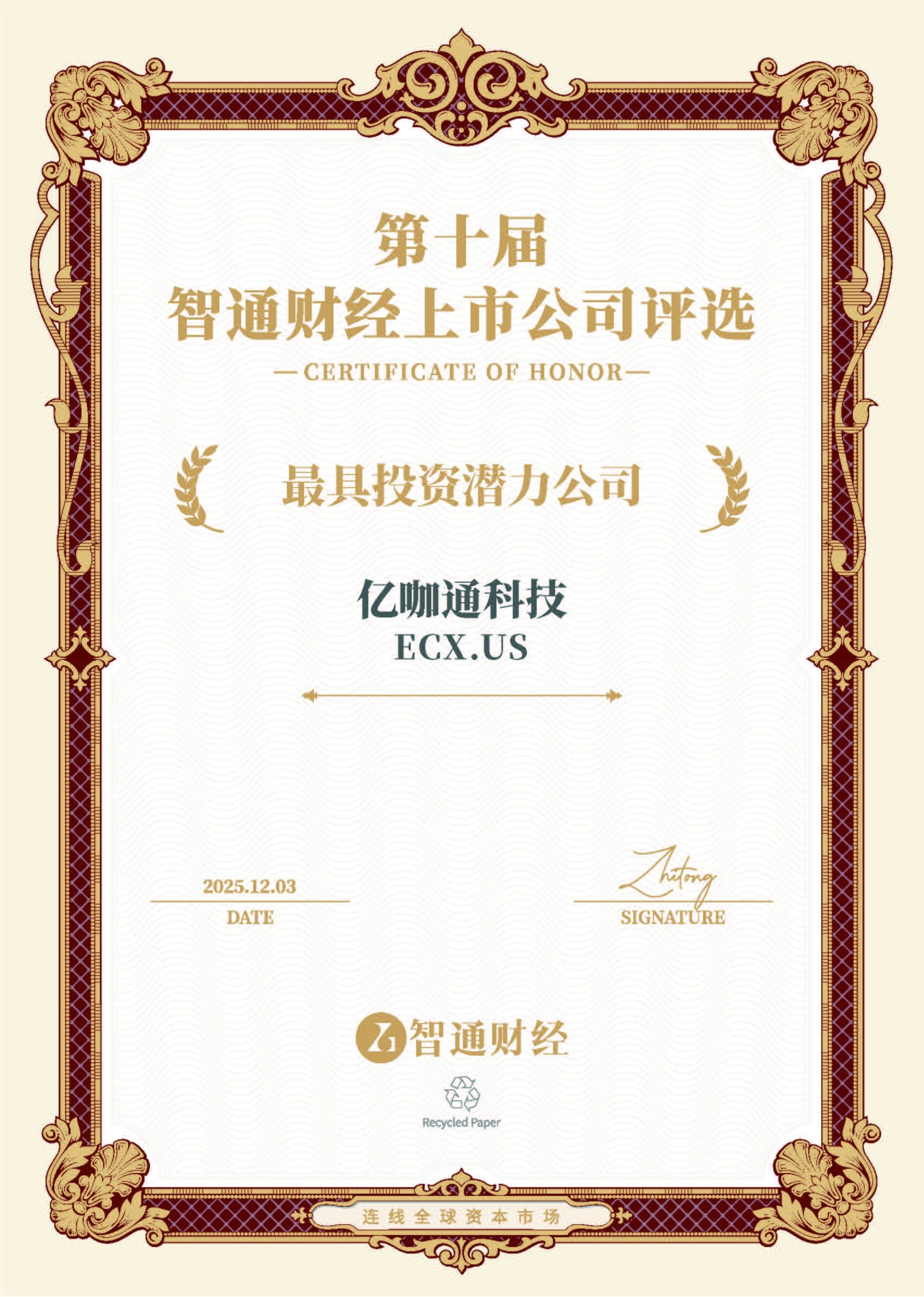 2025年12月3日,在由智通财经与新智基金网联合主办、冬日暖阳Donova独家承办的“第十届智通财经上市公司颁奖盛典”上,亿咖通科技(ECX.US)凭借其清晰的商业模式、广阔的成长前景、领先的盈利增速及突出的估值吸引力,荣获“最具投资潜力公司”奖。