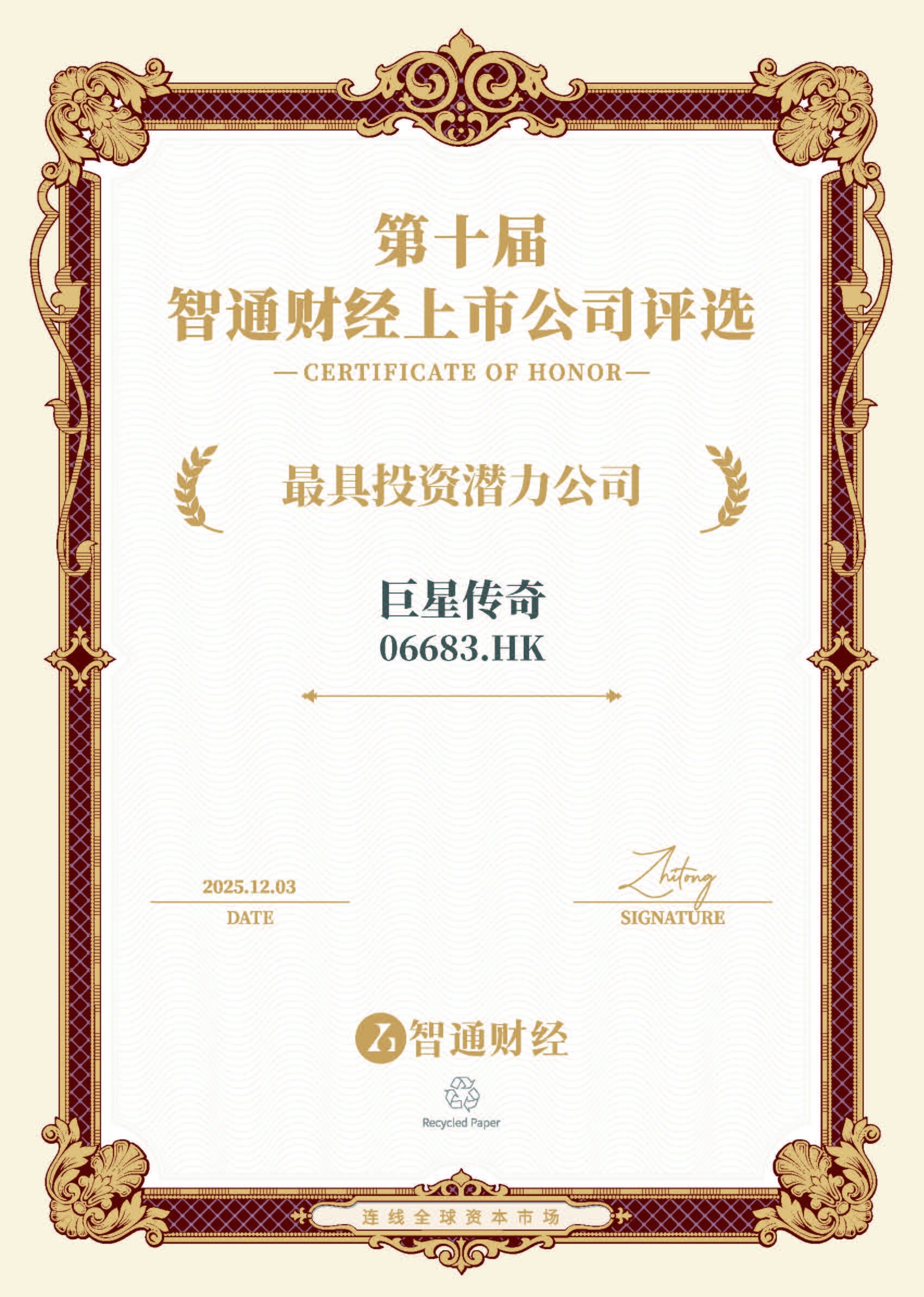 “最具投资潜力公司”奖项聚焦于挖掘具备高成长性与长期投资价值的港美股上市公司,旨在表彰那些商业模式清晰、成长路径明确、盈利增速领先,且在当前估值水平下具备突出吸引力的优秀企业。巨星传奇(06683)此次获奖,充分体现了资本市场对其未来成长潜力与长期投资布局价值的高度认可。