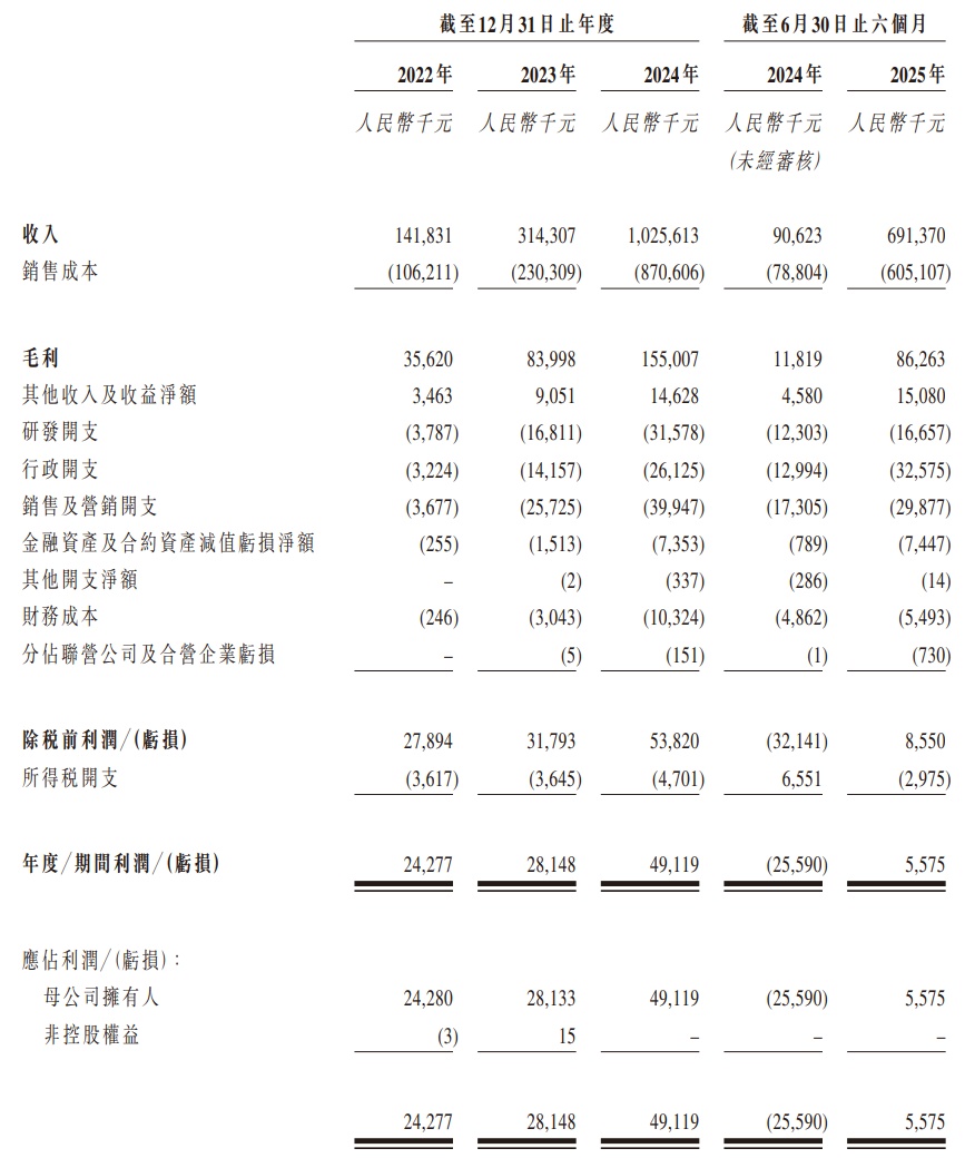 业绩方面,2022年度、2023年度、2024年度及2025年截至6月30日止六个月,果下科技实现收入分别约为1.42亿元、3.14亿元、10.26亿元、6.91亿元人民币;同期,年度/期间利润为2427.7万元、2814.8万元、4911.9万元、557.5万元人民币。