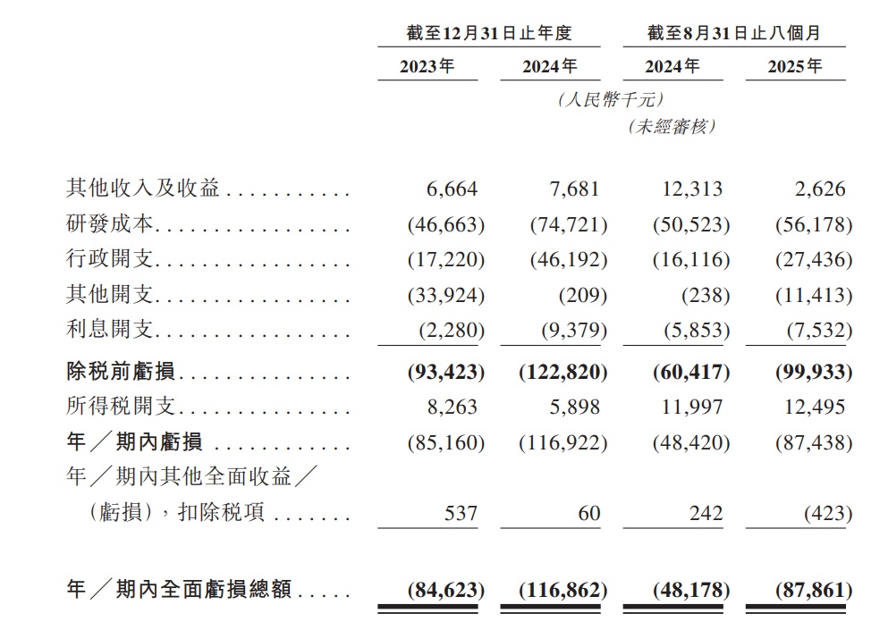 财务方面,公司于往绩记录期间产生经营亏损。截至2023年及2024年12月31日止年度以及截至2024年及2025年8月31日止八个月,公司的全面亏损总额分别约为人民币8462.3万元、人民币1.17亿元、人民币4817.8万元及人民币8786.1万元。公司的绝大部分亏损来自研发成本、其他开支、行政开支及利息开支,原因是公司扩展业务运营。