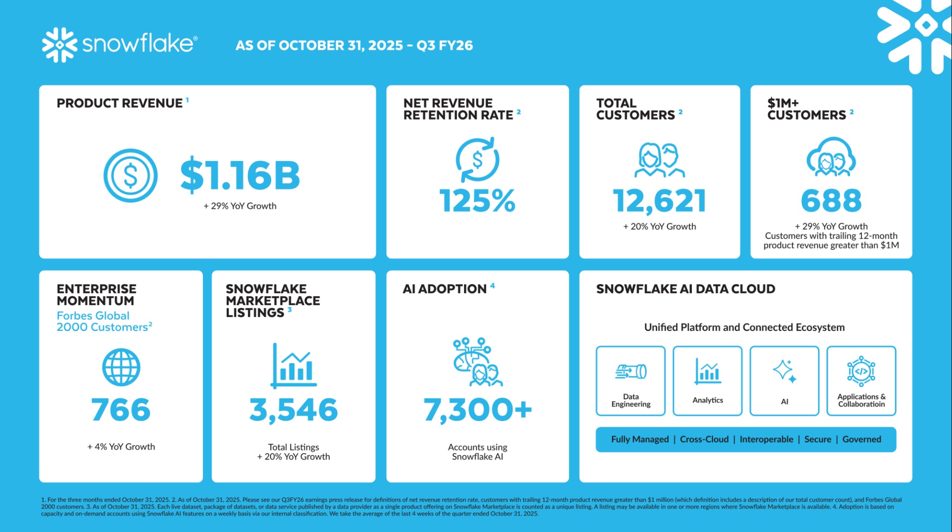 智通财经APP获悉,Snowflake(SNOW.US)周三公布了超预期的第三财季业绩,然而,该公司提供的营业利润率展望低于分析师预期,并且其产品营收预测未能满足投资者对更高增长率的期待,这引发了投资者对其新型人工智能(AI)工具盈利能力的担忧。受此影响,该公司股价盘后出现下挫。