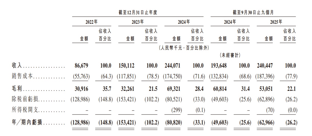 于2022年度、2023年度、2024年度及2025年截至9月30日止九个月,公司分别录得收入8667.9万元、1.5亿元、2.44亿元及2.4亿元。