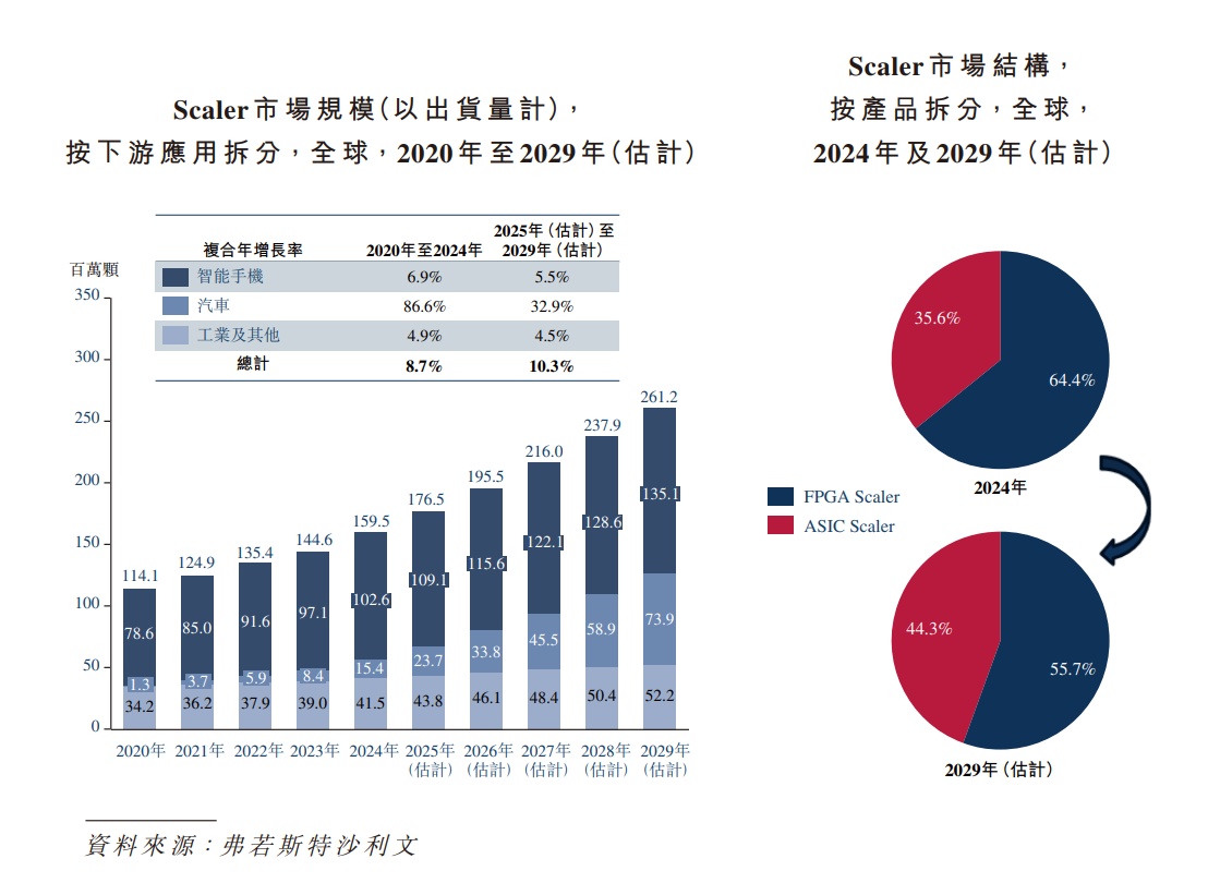 从市场规模来看,全球Scaler市场在中大尺寸OLED等新兴显示技术渗透,以及智能手机维修与回收市场扩张的带动下持续增长。全球Scaler出货量从2020年的约1.14亿颗增长至2024年的约1.6亿颗,期间复合年增长率为8.7%。预计在高端显示屏应用增加、视频接口标准持续演进及终端维修生态日趋成熟的共同推动下,全球Scaler出货量将在2025年至2029年期间以10.3%的复合年增长率增长至2.61亿颗。