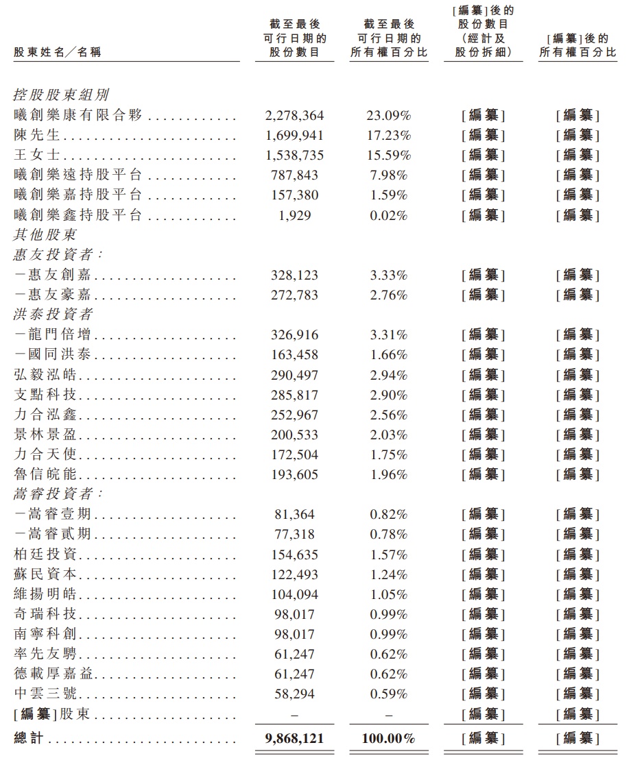 截至2025年11月26日,陈先生及王女士共同控制公司股东会65.51%的投票权,其中(i)陈先生直接实益拥有17.23%;(ii)王女士直接实益拥有15.59%;及(iii)曦创乐康有限合伙、曦创乐远持股平台、曦创乐嘉持股平台及曦创乐鑫持股平台分别实益拥有23.09%、7.98%、1.59%及0.02%。曦创乐康有限合伙、曦创乐远持股平台、曦创乐嘉持股平台及曦创乐鑫持股平台的普通合伙人均为曦创科技,该公司由陈先生及王女士全资拥有。