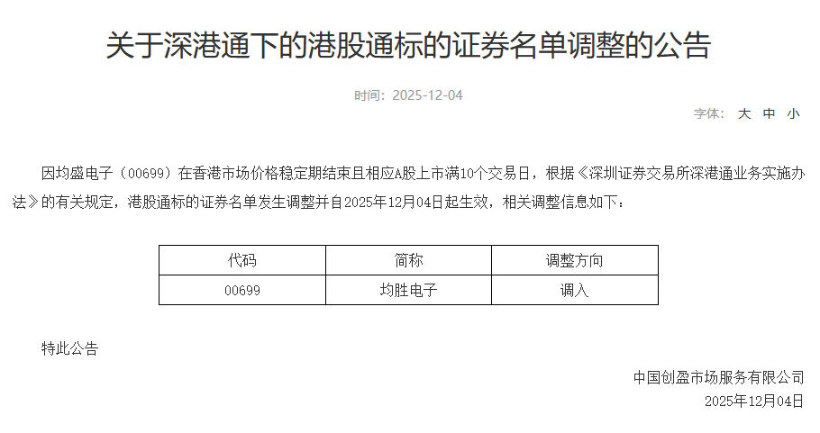 智通财经APP获悉,12月4日,深交所发布公告称,因均胜电子(00699)在香港市场价格稳定期结束且相应A股上市满10个交易日,根据《深圳证券交易所深港通业务实施办法》的有关规定,港股通标的证券名单发生调整并自2025年12月04日起生效。