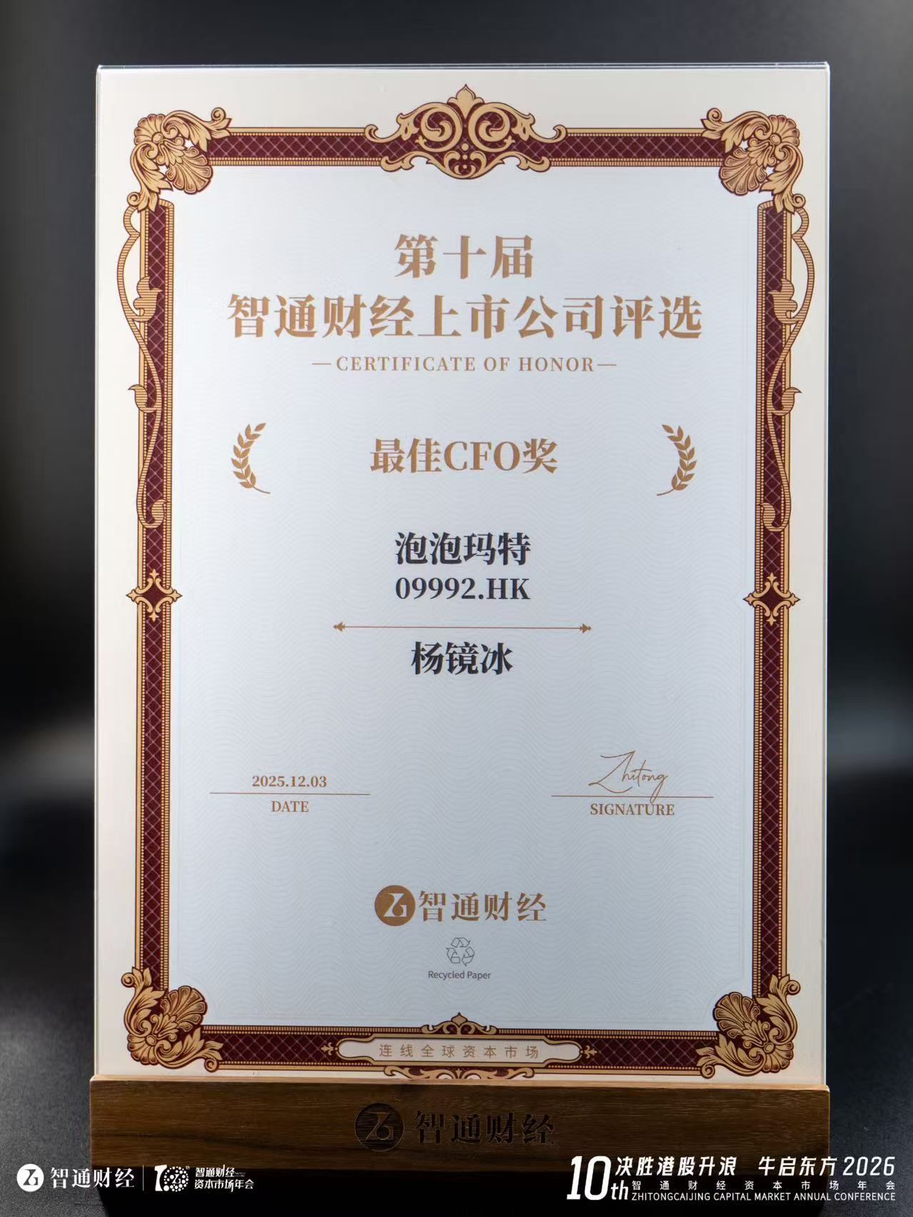 2025 年 12 月 3 日,在由智通财经与新智基金网联合主办、冬日暖阳 Donova 独家承办的 “第十届智通财经上市公司颁奖盛典” 上,泡泡玛特(09992)杨镜冰先生凭借其优秀表现荣获最佳CFO奖。