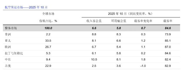 10月份,国际航线的收入客公里(RPK)同比增长 8.5%,亚太和中东地区实现两位数增长。除美洲以外,所有地区的载客率均有提高。