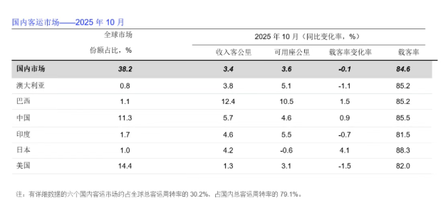 2024年10月,国内客运量(RPK)增长3.4%,载客率下降0.1个百分点至84.6%,基于运力扩张3.6%。美国国内市场在经历了两个月的萎缩后,恢复温和增长。巴西国内市场表现突出,增长12.4%。