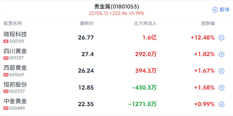 贵金属板块走高,晓程科技领涨,四川黄金、西部黄金等跟涨。