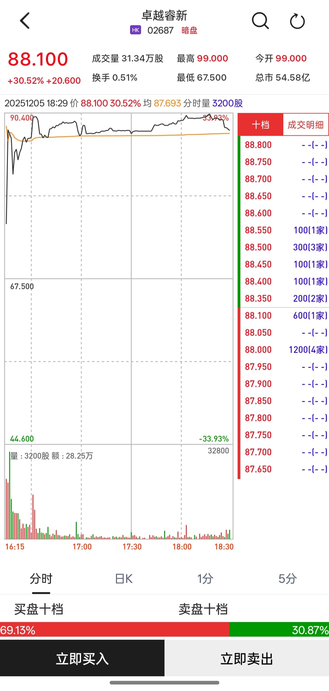 智通财经APP获悉,卓越睿新(02687)将于12月8日(周一)在香港挂牌。截至收盘,利弗莫尔证券暗盘交易显示报价88.10港元,较招股价67.50港元上涨30.52%,每手100股,不计手续费,每手赚2060港元。