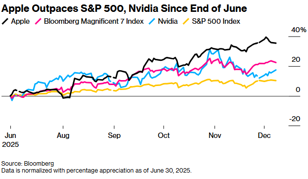 在2025年上半年,苹果是"美股七巨头"中表现第二差的股票,截至6月底其股价暴跌了18%。但自那以后,情况发生了逆转,苹果股价飙升了35%,而Meta平台和微软等人工智能宠儿的股价已陷入下跌,甚至连英伟达的表现也相形见绌。同期,标普500指数上涨了10%,科技股权重较高的纳斯达克100指数上涨了13%。