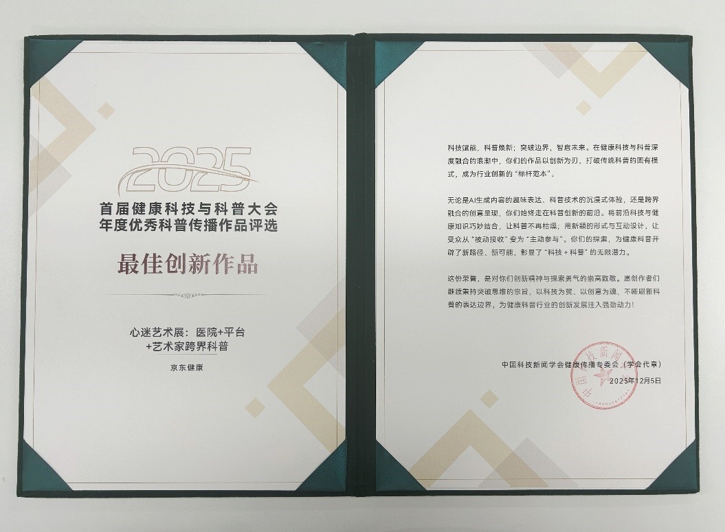 会上,京东健康携手武汉协和医院、武汉大学人民医院、武汉市精神卫生中心及知名艺术家、顶级专家共同打造的“心迷艺术展”,还斩获了大会年度优秀科普传播作品评选“最佳创作作品”奖。